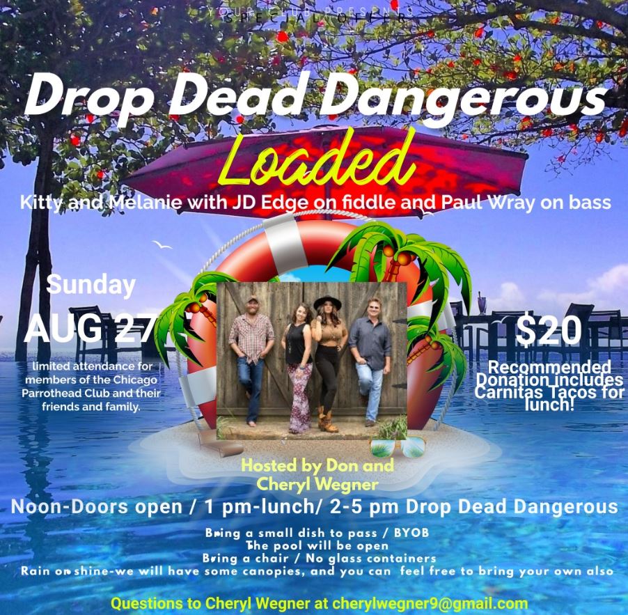 Drop Dead Dangerous, Loaded! Join us for the only scheduled Drop Dead Dangerous Loaded show in Chicagoland area for 2023! Joining Kitty and Melanie are JD Edge on fiddle and Paul Wray on bass. Sunday August 27, 2023 At Cheryl and Don Wegner’s house Noon-Doors open 1 pm-lunch 2-5 pm Drop Dead Dangerous This is a limited attendance, invitation only, private show for members of the Chicago Parrothead Club and their friends and family. A few things to know: Suggested donation $20 pp and includes lunch. Carnitas Tacos provided, bring a small dish to pass and BYOB The pool will be open Bring a chair No glass containers Rain or shine-we will have some canopies, and you can feel free to bring your own also Donation will be accepted at the door, but prepay is highly encouraged. Each prepaid donation will receive an entry into the raffle