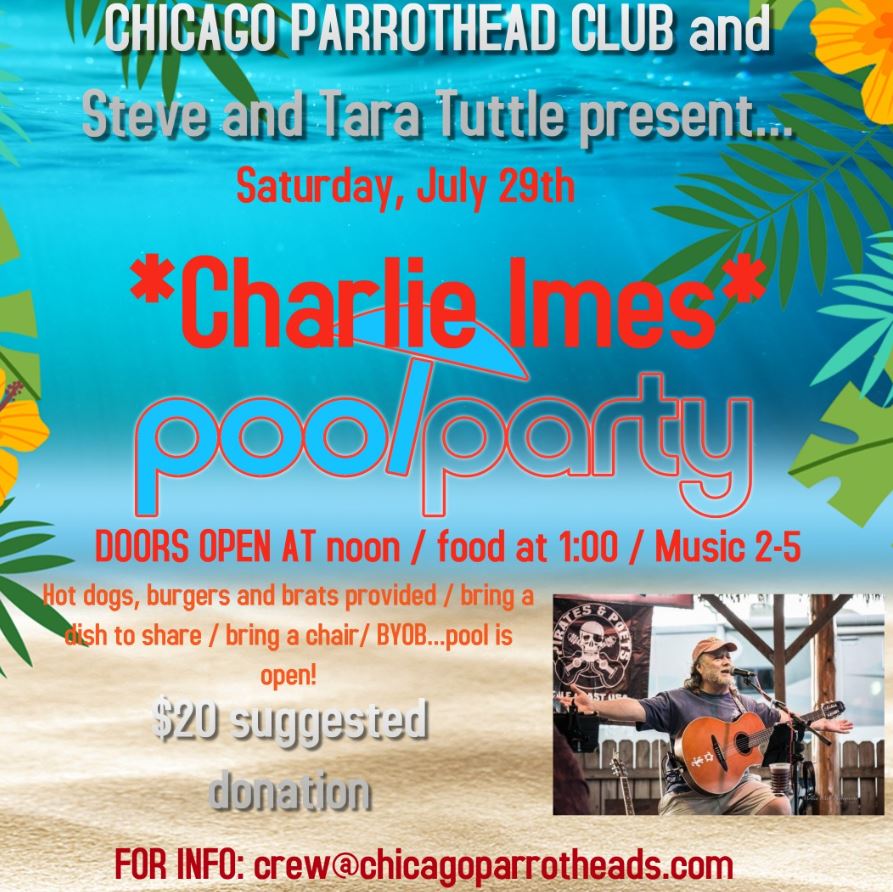 Charlie Imes is coming to Chicago! Saturday July 29, 2023 At Steve and Tara Tuttle’s house Noon-Doors open 1 pm-lunch 2-5 pm Showtime! This is a limited attendance, invitation only, private show for members of the Chicago Parrothead Club and their friends and family. A few things to know: Suggested donation $20 pp bring a small dish to pass and BYOB The pool will be open Bring a chair No glass containers Rain or shine-we will have some canopies, and you can feel free to bring your own also Donation will be accepted at the door, but prepay is highly encouraged. Each prepaid donation will receive an entry into the raffle