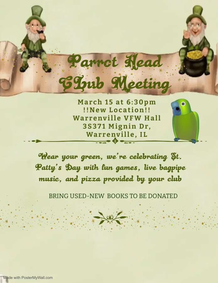 – Wear your green, we’re celebrating St. Patty’s Day with fun games, live bagpipe music, and pizza provided by your club! – Time to clean out the shelves and donate those books. Bring used books to the March meeting. – There will be Friendship Fund goodies for sale! – A fun game to play with old phriends and new.