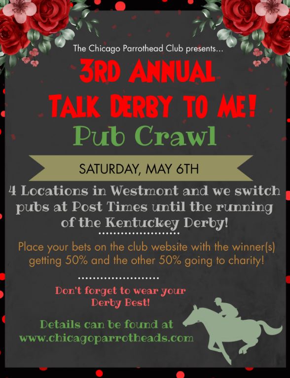It’s back! Are you ready for the 3rd Annual “Talk Derby to Me” Derby Day Bar Crawl. We will be hitting up the same 4 locations as last year. We will start at 1:00 pm and we will move to each location in time for the next Post Time until our final location to watch the Kentucky Derby! 1:00 Uptown 12 W. Burlington Westmont 2:30 Potbelly Pub 24 N. Cass Westmont 3:30 Bishops Chili 250 N. Cass Westmont (CASH ONLY) 4:20 Neat 246 N. Cass Westmont Will have some reserved tables by the 80″ screen. 5:45 Kentucky Derby!!! We will also be having a 50/50 raffle again to support our charities. It will be a $5 bet per horse, and you can bet for as many horses as you like. Half of all proceeds will go to the club charities and the other half will be split amongst the winners of the races. Whichever horse wins….all members that bet on that horse will split the winnings. Do you have your Derby outfit ready?!?!
