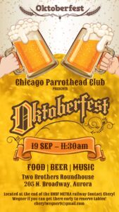 Dust off your lederhosen or dirndl, it’s time for Oktoberfest! The Chicago Parrothead Club will be celebrating at Two Brothers Roundhouse in Aurora twobrothersbrewing.com/event/two-brothers-roundhouse-oktoberfest-2021/ Sept. 19, 11:30 am. 205 N. Broadway, Aurora, IL 60505 <www.google.com/maps/place/205+N+Broadway,+Aurora,+IL+60505/@41.7612236,-88.3107049,17z/data=!3m1!4b1!4m5!3m4!1s0x880efabc638644a9:0x567af9fbaca7f8fd!8m2!3d41.7612236!4d-88.3085162>