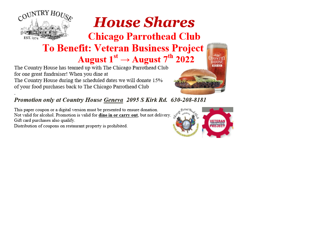 House Shares! The Chicago Parrothead Club will be attending our One Particular Wednesday To Benefit: Veteran Business Project on August 3rd! (The event will run August 1st – August 7th 2022) The Country House has teamed up with The Chicago Parrothead Club for one great fundraiser! When you dine at The Country House during the scheduled dates we will donate 15% of your food purchases back to The Chicago Parrothead Club for the Veteran Business Project! . Promotion only at Country House Geneva 2095 S Kirk Rd. 630-208-8181 Fins Up!