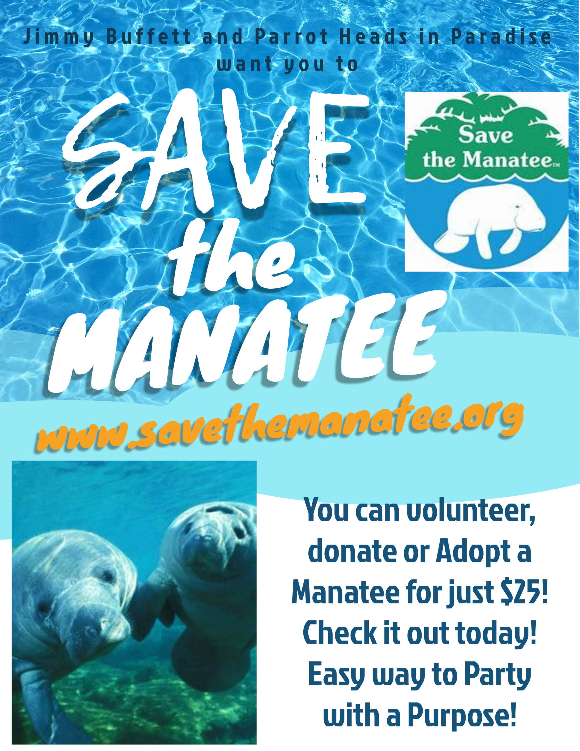Jimmy Buffett and Parrot Heads in Paradise want you to help Save the Manatee! www.savethemanatee.org.