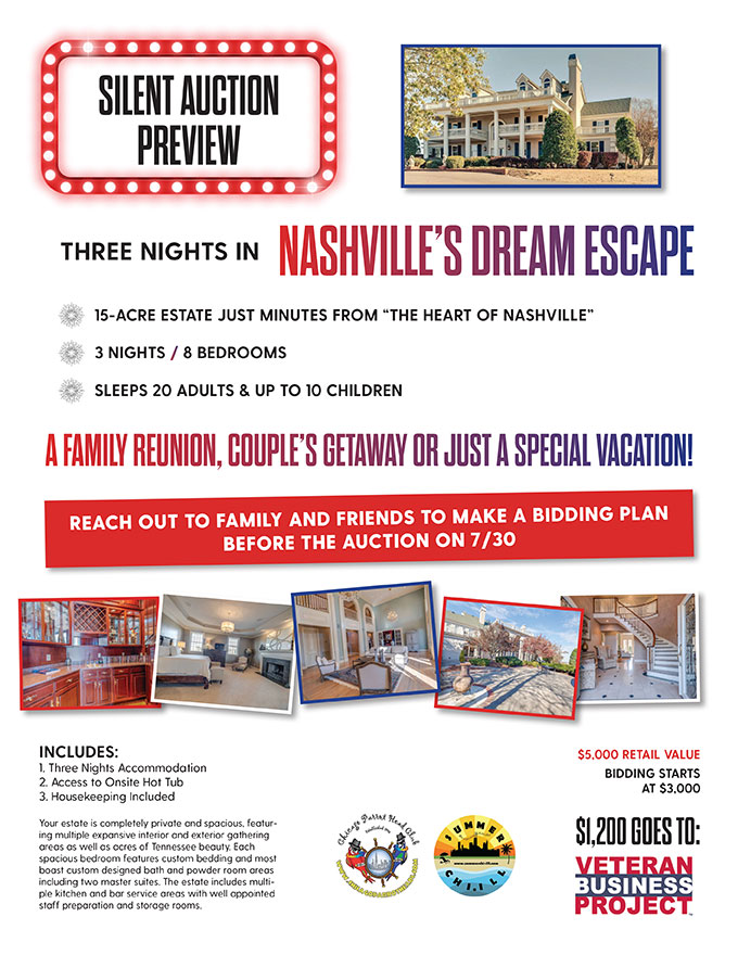 Who wants to stay near Nashville in a mansion with 20 adults and up to 10 children? Then you can bid on this item at Summer Chi.ill! Plan that vacation now and go in on it with your friends or family! Only at Summer Chi.ill!!! Still time to register at www.summerchi-ill.com!