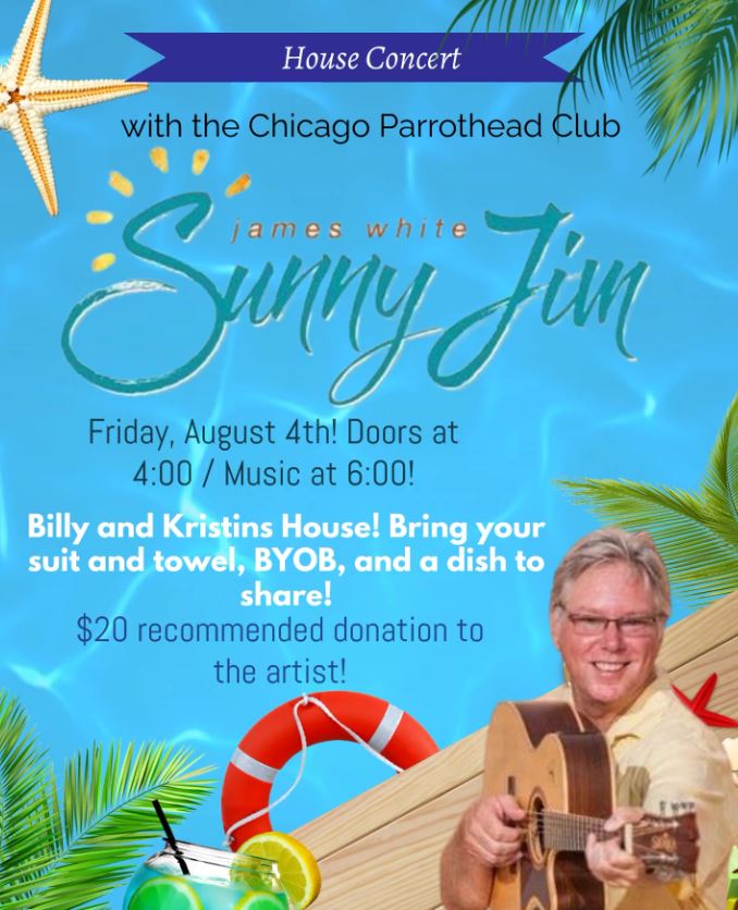 Sunny Jim is coming to Chicago for one night only! Friday, August 4th, at the home of Billy and Kristin (watch for email club details to RSVP and for the address!) Doors will open at 4:00pm for some sun and fun before the music starts at 6:00pm. House concert rules apply! Standard recommended donation of $20 to the artist! BYOB, a chair, a dish to share, and a suit and towel if you want pool time! See you there with fins up for some tropical, sunny Florida vibes!