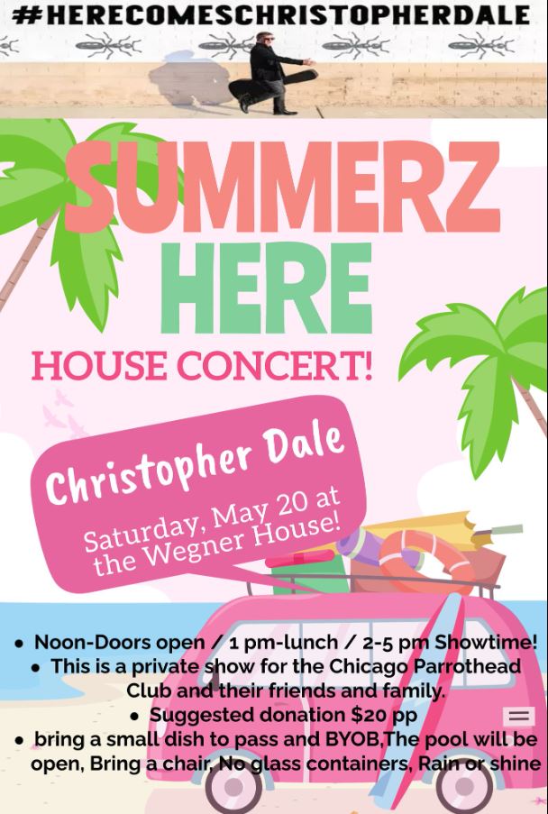 Christopher Dale is coming to Chicago! Saturday May 20, 2023 At Cheryl and Don Wegner’s house Noon-Doors open 1 pm-lunch 2-5 pm Showtime! This is a limited attendance, invitation only, private show for members of the Chicago Parrothead Club and their friends and family. A few things to know: