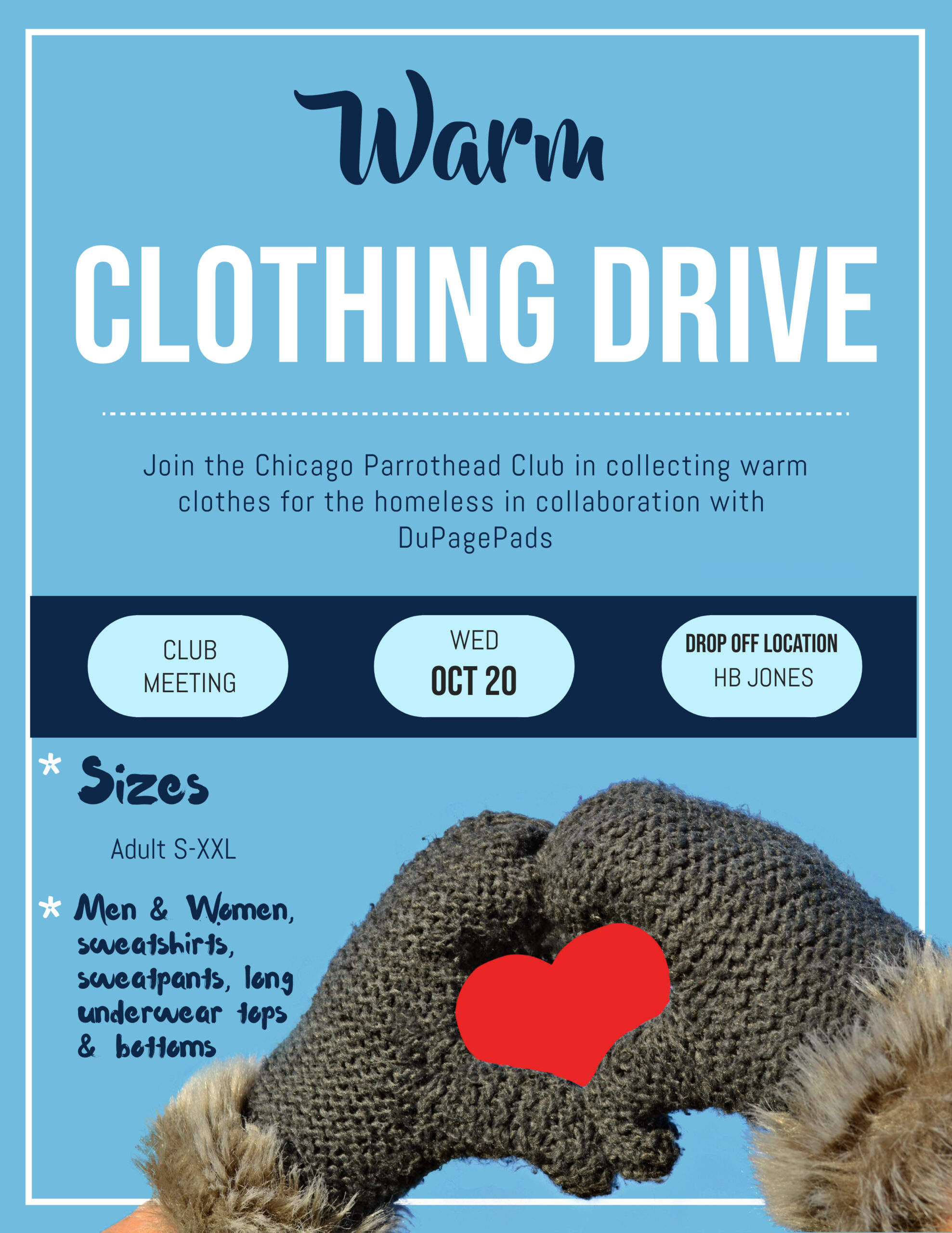 Join the Chicago Parrothead Club in collecting warm clothes for the homeless. “The mission of DuPagePads is to end homelessness in DuPage County, Illinois. Our signature year-round programs feed and shelter individuals and families who are homeless, connect them to case management and other services that can address the underlying cause of their homelessness.” During October we will be collecting ONLY these items for PADS: For both men and women–sweatshirts and sweatpants, long underwear tops and bottoms. Sizes S-XXL At this time, PADS is only accepting new items. Bring your donation to the October club meeting or contact Cheryl Wegner if you can’t make it to the meeting.