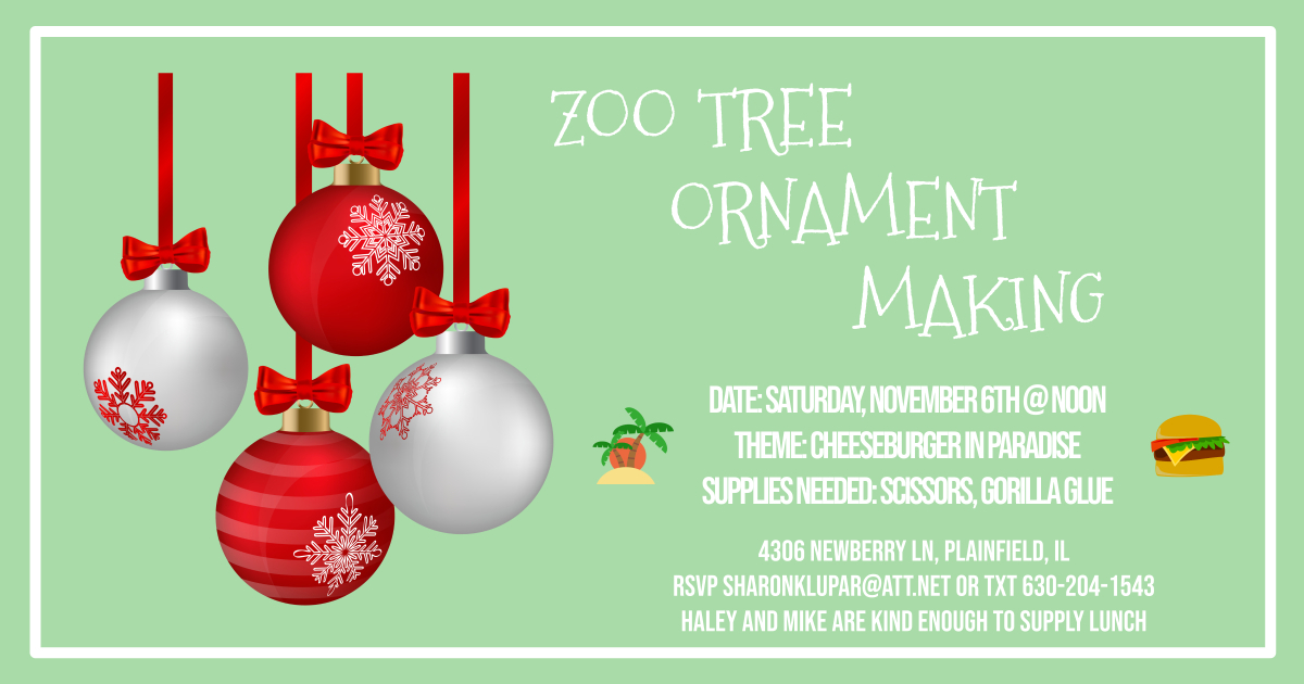 Get your crafting skills ready as it’s that time of year once again…Ornament Making for the Zoo Tree! Haley & Mike Warren were gracious enough to host the event at their house and even provide lunch. Supplies will be available to make Cheeseburger in Paradise themed ornaments but if you can, bring scissors and Gorilla glue. We need your help put them together! Date: Saturday November 6th Time: Noon Place: 4306 Newberry Lane Plainfield, IL